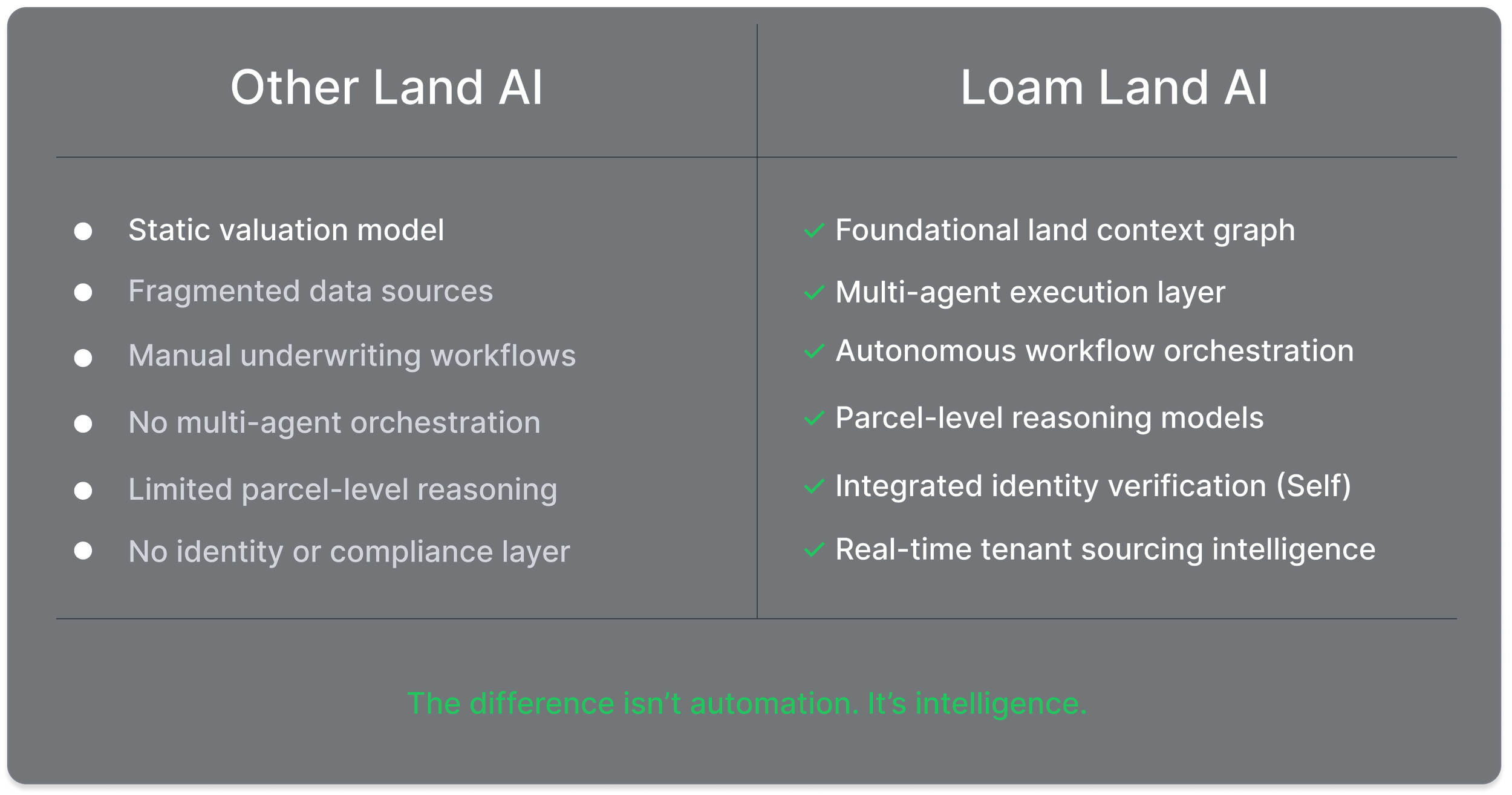 Most land platforms provide static analytics. Loam builds autonomous, context-aware intelligence.