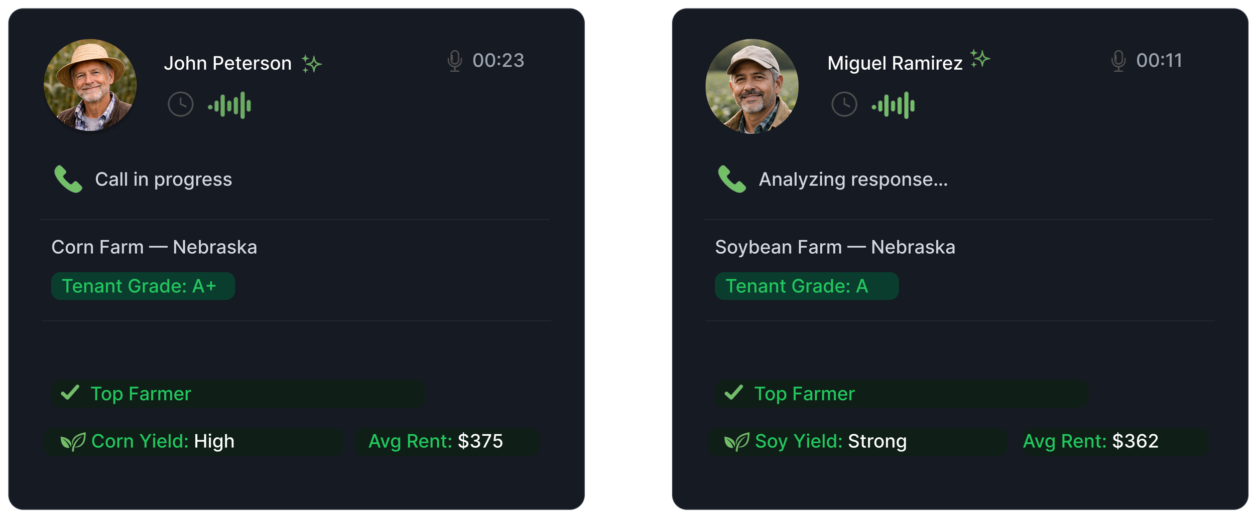Autonomous voice agents proactively identify, qualify, and score high-quality farm tenants in real time. By combining live outreach with performance and yield intelligence, Land AI transforms tenant sourcing into a scalable, data-driven workflow.