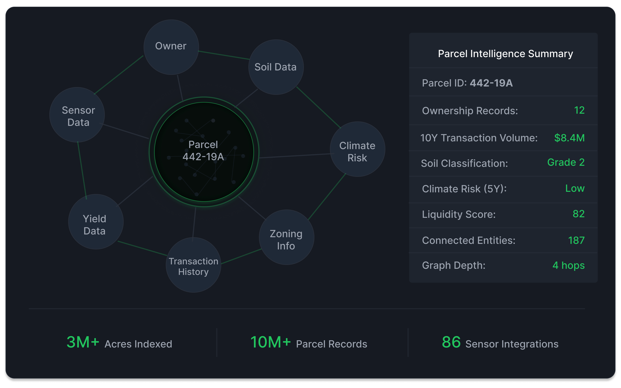 Structured parcel-level intelligence across ownership, soil, climate, yield, zoning, and transaction history.